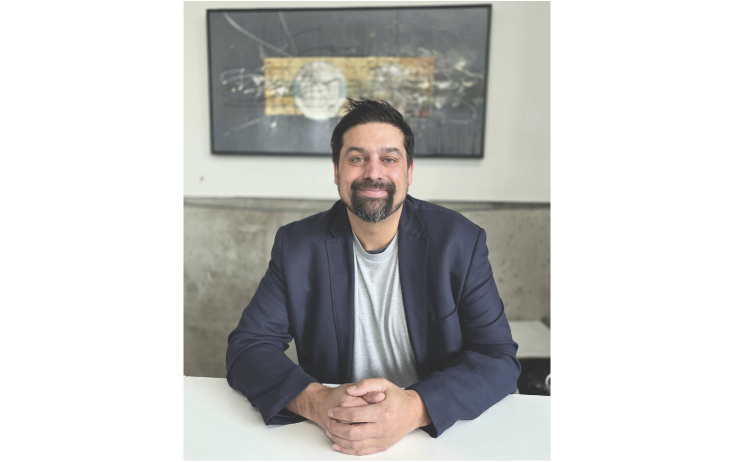 Paintings, by contrast, often condense layers of information into a single surface and require time to interpret, he said. His work explores how painting can respond to a world dominated by fast-moving digital imagery.