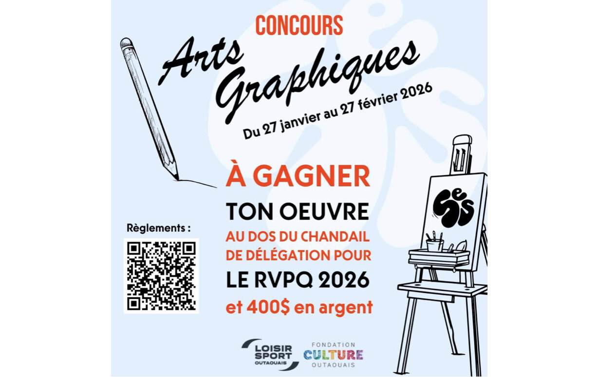 Le lauréat aura la chance de remporter une bourse de 400 $ offerte par la Fondation pour les Arts, les Lettres et la Culture en Outaouais, en plus de voir son œuvre imprimée au dos du chandail officiel de la délégation de l’Outaouais lors du Rendez-vous panquébécois (RVPQ) 2026.