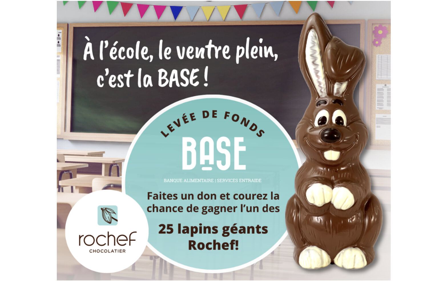 Afin de diminuer l’insécurité alimentaire chez les élèves du primaire et du secondaire de l’Outaouais, Rochef Chocolatier en partenariat avec la banque alimentaire BASE, le Centre de services scolaire des Portages-de-l’Outaouais (CSSPO) et les commerces participants lancent une deuxième édition de la levée de fonds « À l’école, le ventre plein, c’est la BASE ».