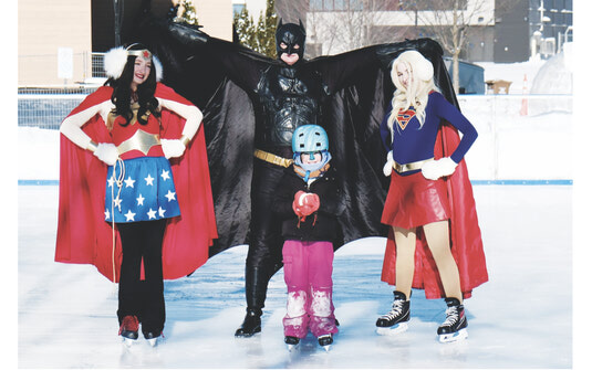 Noäm Prost Brossard, 6, poses with Wonder Woman, Superwoman, and Batman at the "Skate with Superheroes" event held at the Aylmer Marina's refrigerated skating rink on Sunday, February 1, 2026. The free family activity was organized by the "Christmas in Old Aylmer" group. This was the group's last event until next winter.
