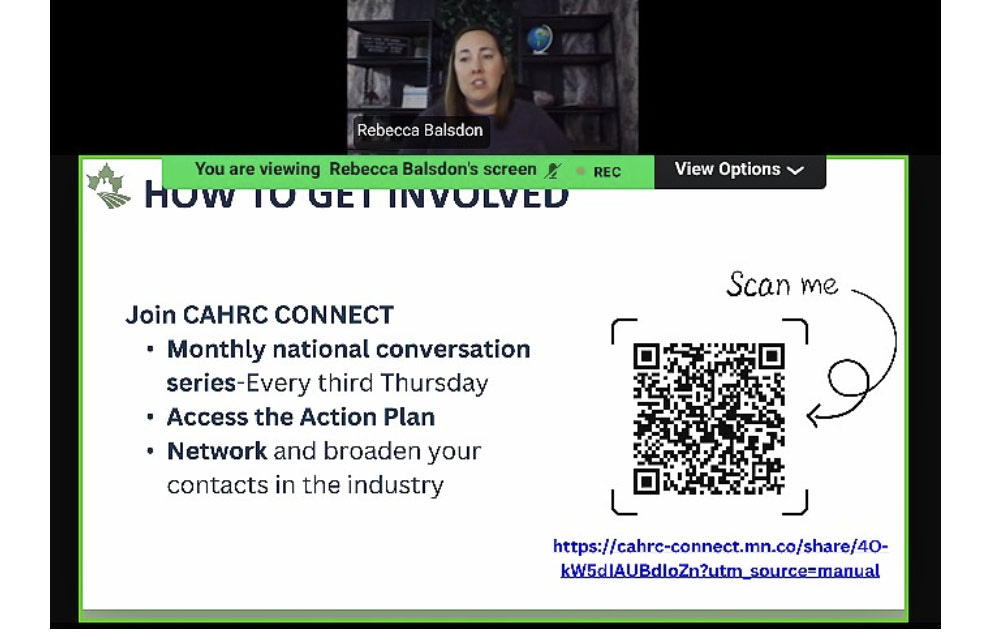 Rebecca Balsdon, who chaired the session, manages stakeholder engagement at CAHRC and also co-manages a dairy farm in Clarendon, Quebec. Speaking during the webinar, she shared that the work is personally meaningful, adding that she too understands the day-to-day demands women face in agriculture.